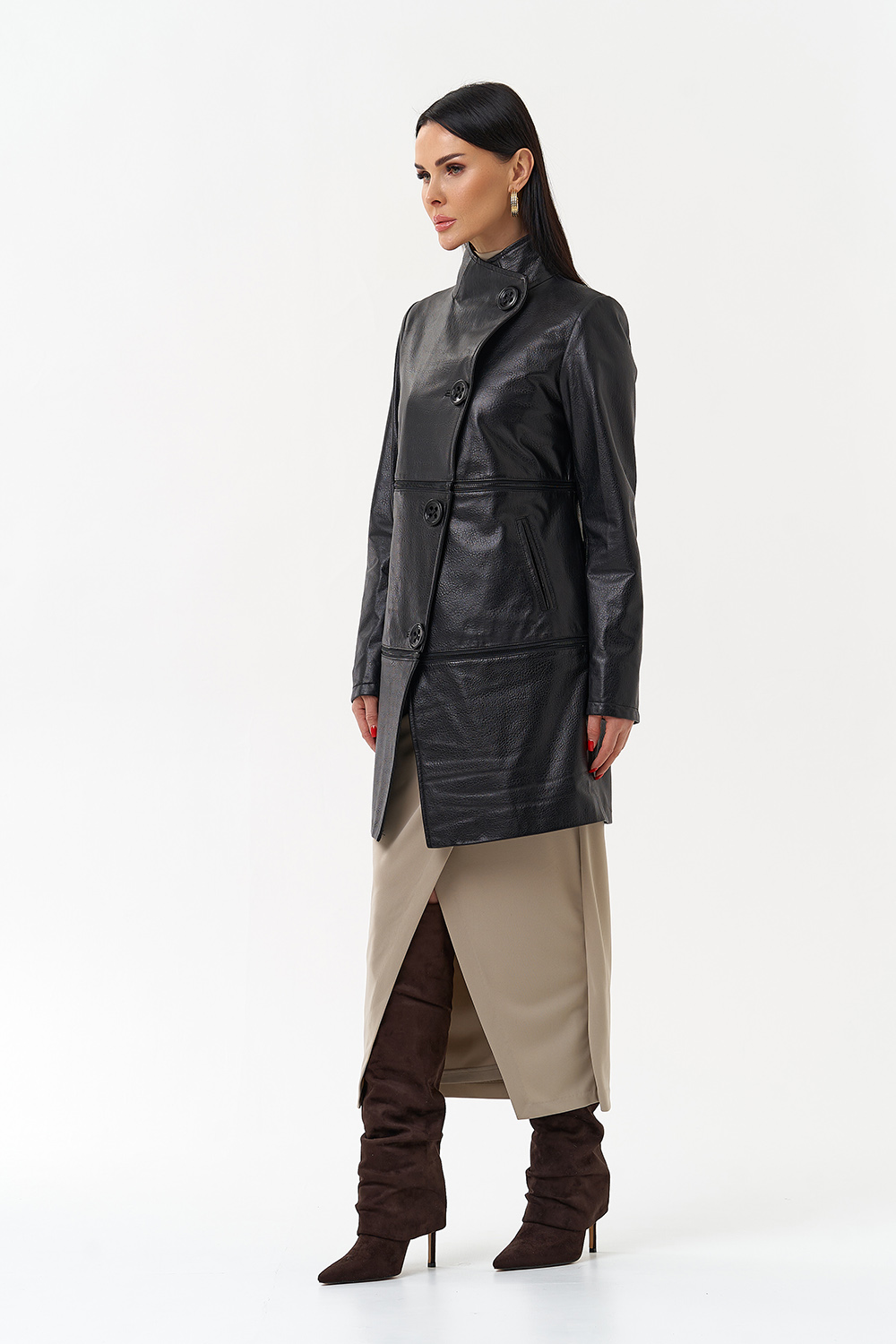 Данная модель выполнена из высококачественной мягкой матовой кожи. Прямой силуэт обеспечивает идеальную посадку по фигуре. Изюминкой данной модели являются две горизонтально вшитые металлические молнии, которые при небольшом усилии трансформируют данную модель в три самостоятельных изделия длиной (кожаный френч 80 см, Кожаная куртка 55 см и кожаное болеро 30см). Данная модель очень универсальна, подойдёт обладательницам любого возраста и стиля.